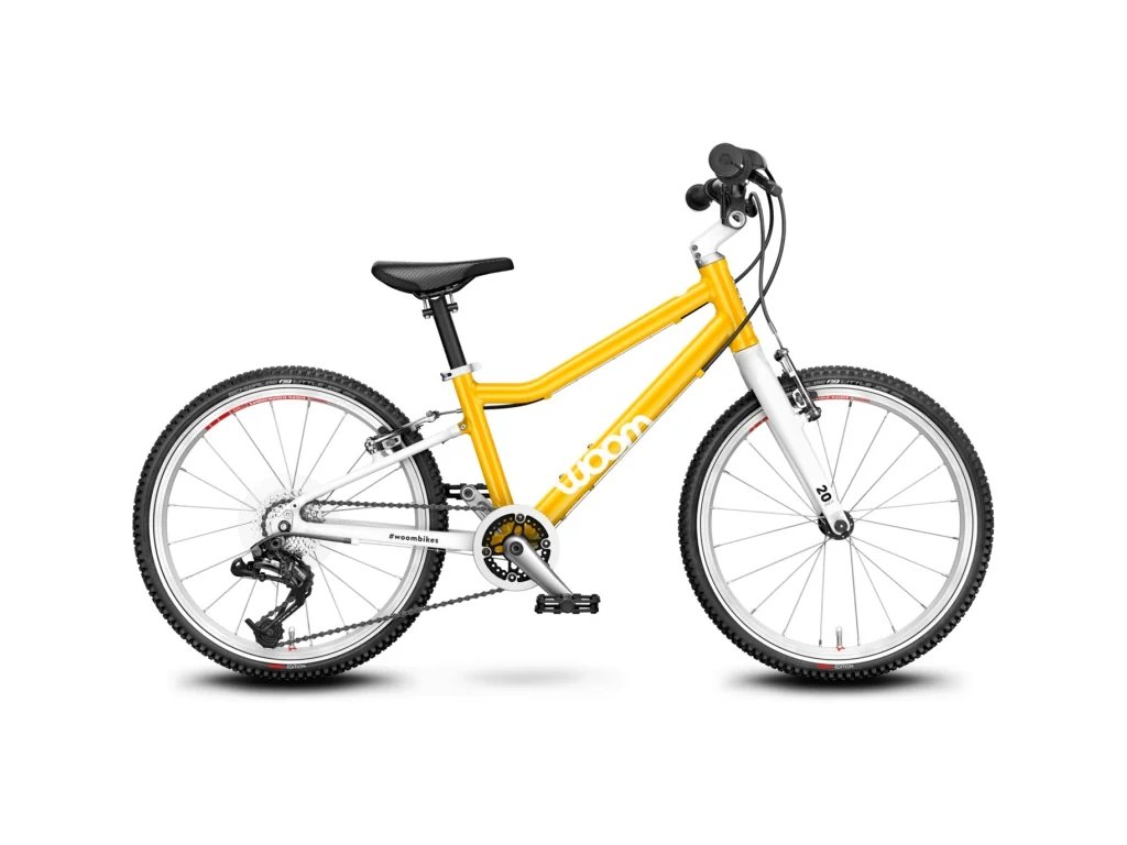 Lehké dětské kolo 20" s vynikajicí váhou 7,4 kg pro děti ve věku od 5 - 8 let. Ke kolu si můžete vybrat spoustu doplňků WOOM 4 - model řady G (2021) upravený design rámu a vidlice nová geometrie vylepšený představec lehčí výplet (1,8 namísto 2,0mm) vylepšená objímka hlavového složení nová objímka sedlovky nové woom pedály nové woom ergo gripy nový narrow wide převodník upravená šířka a stoupání řídítek Specifikace WOOM 4: Rám : lehký, vysoce kvalitně zpracovaný AA-6061 hliník, bezešvé trubky Vidlice : lehká, hliníková s variabilním omezením otočení předního kola Hlavové složení : plně integrované, 1" se zapouzdřenými průmyslovými ložisky Představec : nový, hliníkový 40mm / +15 ° se zapuštěnými šrouby Řídítka: široká, ergonomická pro větší stabilitu ve stylu BMX, průměr 19 mm, šířka 500 mm Gripy : Woom Ergogrip - nejmenší svého druhu Pohon : lehké kované hliníkové kliky 80 mm, 25 x 15T s chranou řetězu Pedály : plastové Brzdy : mini V-brzdy s nastavitelnými pákami pro drobné ruce, měkké zadní a tvrdší přední brzdové botky pro účinné brždění, vysoce kvalitní bowdeny Jagwire pro snížení tření, barevné rozlišené páky brzd a brzdových botek pro snadné rozlišení přední a zadní brzdy. Ráfky : ultralight hliníkové Soopa-Doopa-Hoops, hliníkové náboje se zapozdřenými ložisky Pláště : Kenda 14 x 1,5 s nízkým valivým odporem a reflexním páskem Sedlo : ergonomický design specifický pro daný věk Sedlovka : hliníková s označením minimálního a maximálního zasunutí Váha : 7,7 kg (bez pedálů